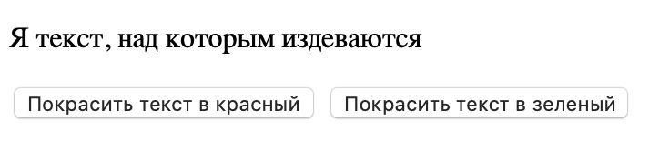 Итак, что мы здесь имеем? Мы имеем тэг p с id="text" и 2 кнопки: одна с id="btnRed", а другая с id="btnGreen". При нажатии на кнопку, текст в тэге p должен перекрашиваться в соответствующий цвет, который указан на кнопке.