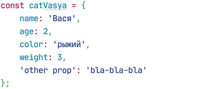 . Теперь для того, чтобы вытащить какое-то значение из объекта, нужно всего лишь обратится к нужному полю в объекте. Например, мы хотим получить цвет котика из этого объекта