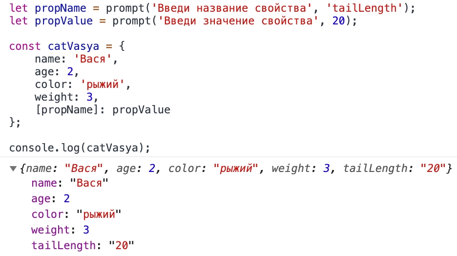 в квадратные скобки и тогда значение этой переменной будет указано как имя свойства объекта, а в само значение свойства нам нужно просто записать переменную propValue