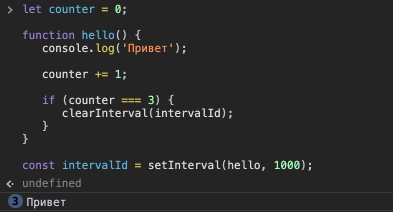 3. Если условие выполняется, следовательно, слово"Привет"будет выведено3 разаи далее нам нужно остановить выполнениеsetInterval, для этого нам поможет методclearInterval.