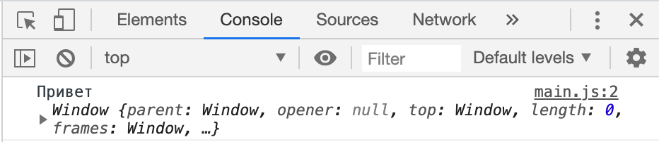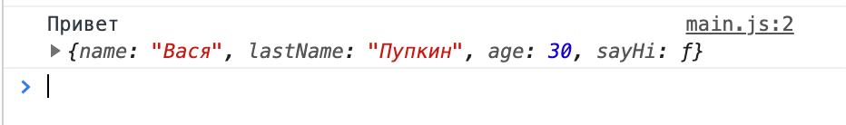 Функция выводит в консоль слово Привет и this. Если заглянуть в консоль, то увидим следующее: