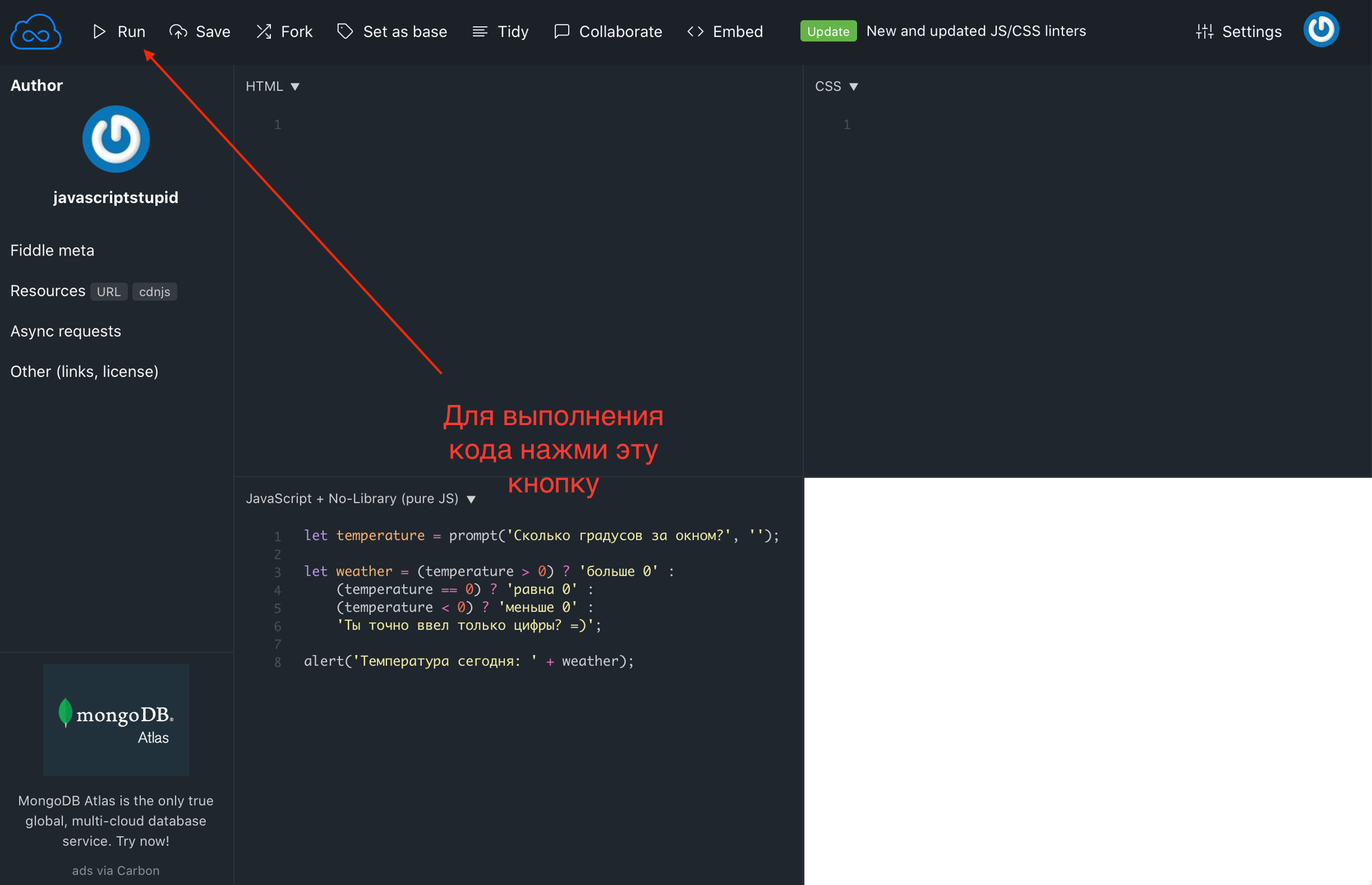 Думаю, что на сегодня достаточно. В нескольких местах оставил ссылки на куски кода в онлайн-редакторе и подписал их «живой пример». Ты можешь перейти по ссылкам, посмотреть код и запустить его нажав кнопку Run
