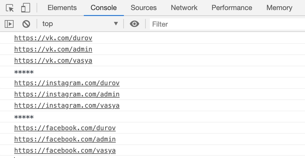console.log(createFacebookLink('vasya'));Получаем результат: